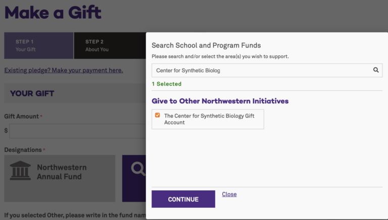 - Search “Center for Synthetic Biology” and Select “The Center for Synthetic Biology Gift Account”.